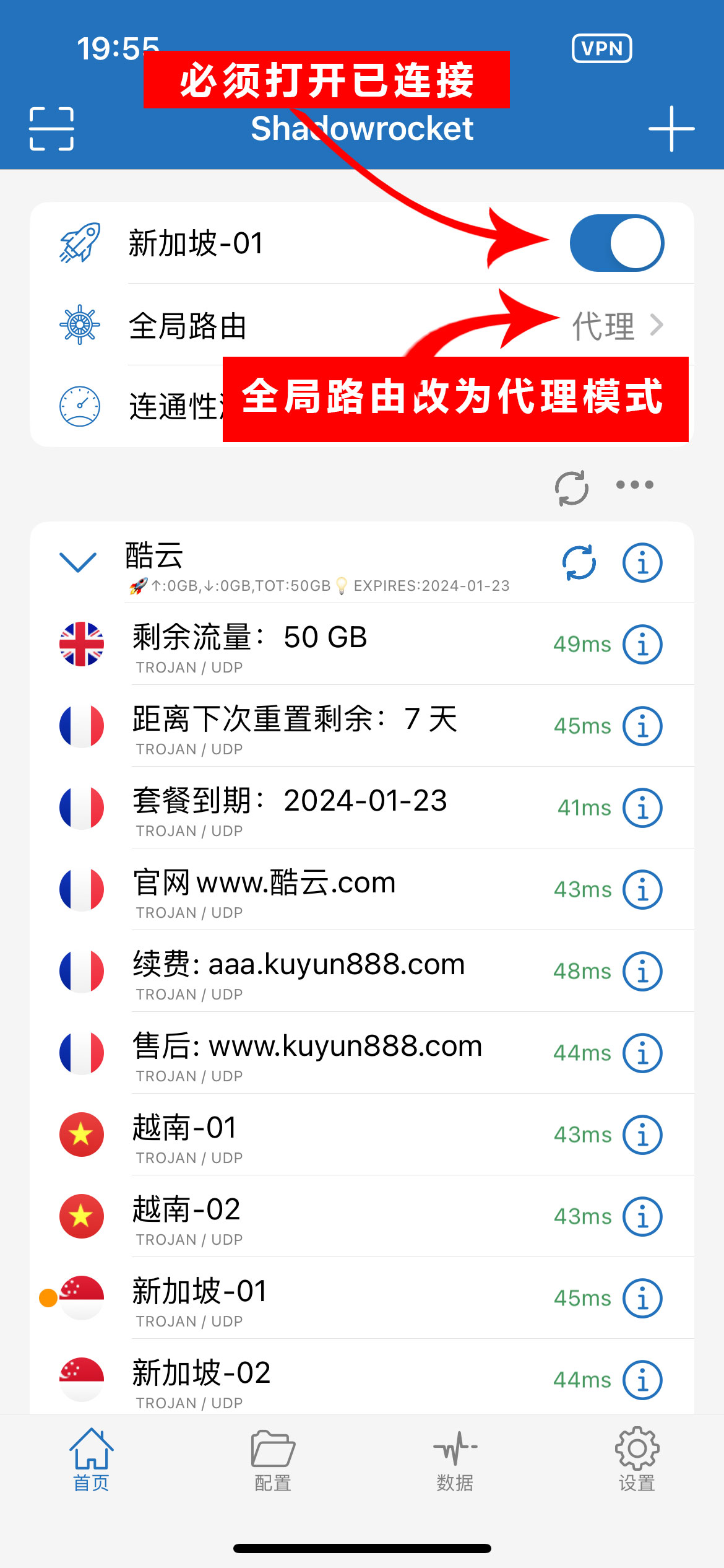 第一步:必须先打开小火箭加速器,并且打开全局模式如下图
