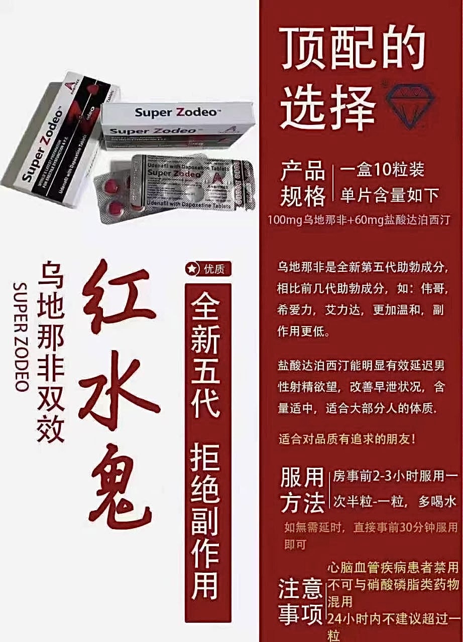 ◾红水鬼(双效) 用于解决男性勃起和早泄的药物,由安必成药业出品。最新5代产品乌地那非,说是最新一代,其实出来也挺长时间了,比起前几代双效,乌地那非双产品少,知名度不高,效果和黑水鬼类似,硬度稍高于黑,主打温和舒适,可喝酒,对副作用敏感用户的最佳选择之一 ◾成分:乌地那非100mg+达泊西汀60mg ◾效果:助勃增硬+延时 ◾特点:均衡舒适 副作用低 ◾规格:一盒10粒