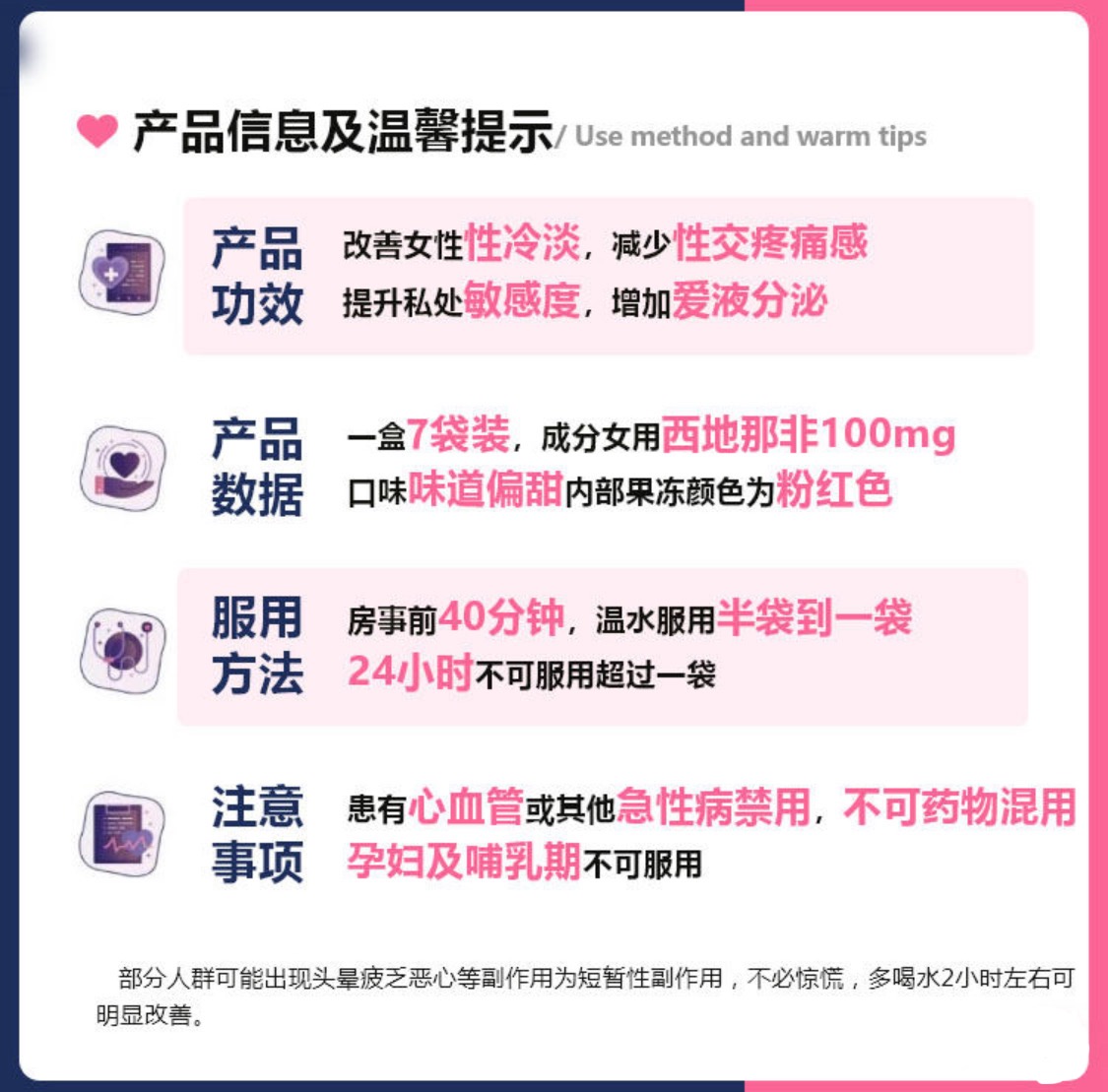 ◾女用果冻(女用伟哥) 服用方便,吸收快,效果猛,增加女性快感,高潮迭起,增加敏感度,改善性冷淡 ◾规格:一盒7包 ◾温馨提示:事前40分钟一袋,孕妇及哺乳期,高血压心脏病患者禁用!