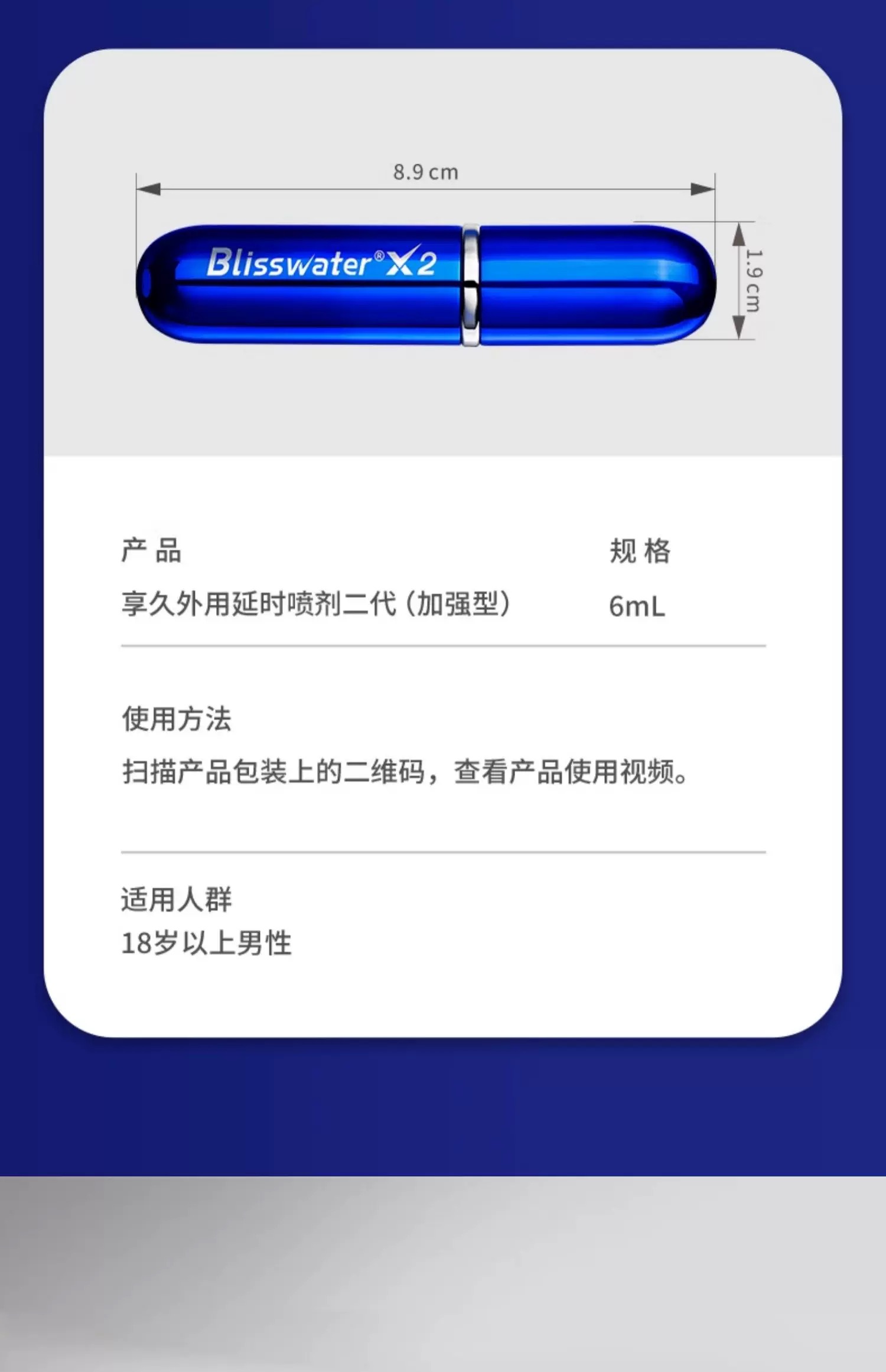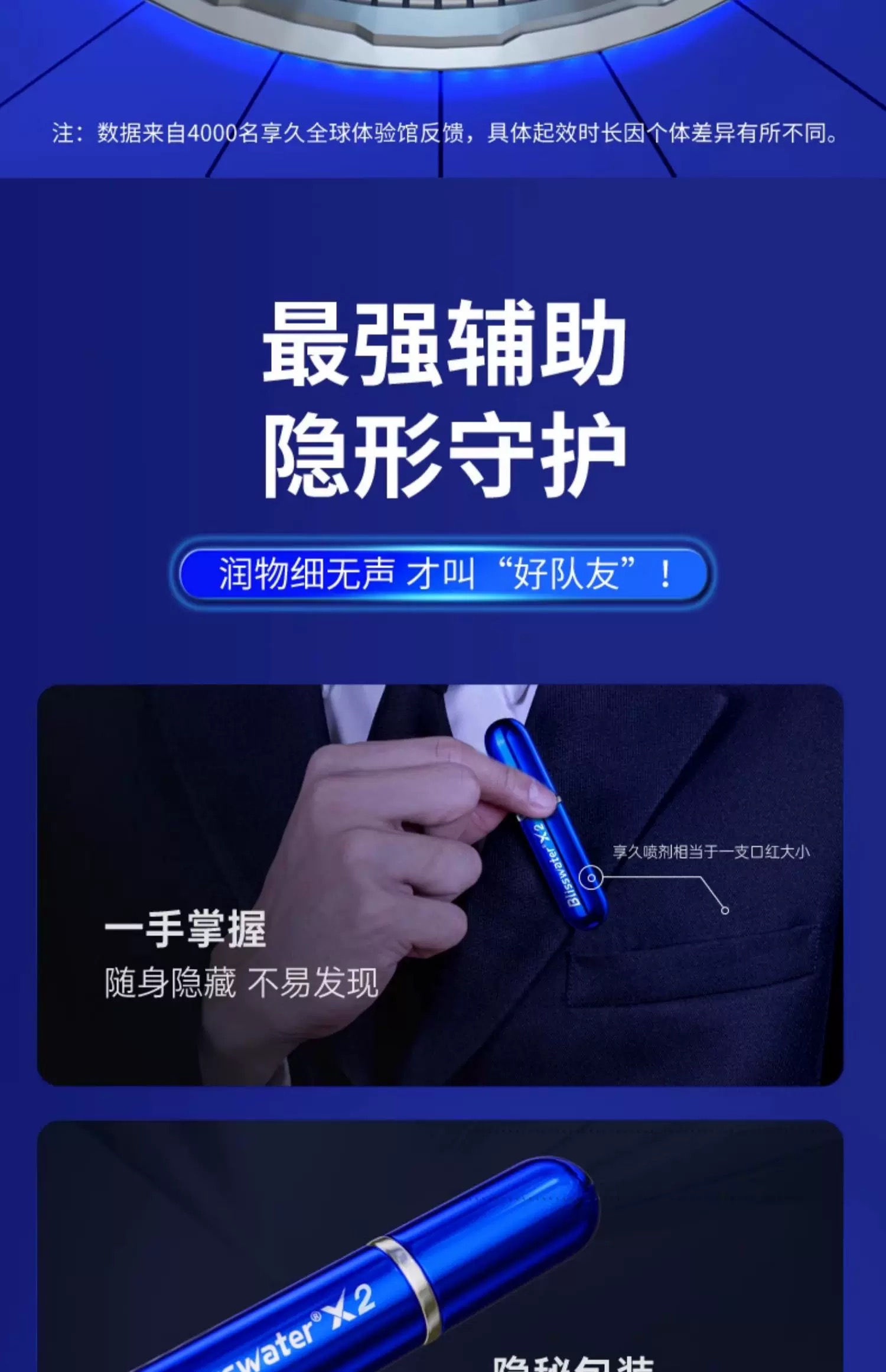◾享久2代加强型(外用延时) 用于解决敏感性早泄外用延时喷剂。享久外用延时喷剂算是外用延时的天花板,效果非常好,纯天然配方,不麻木口爱无察觉,最大程度保留啪啪啪快感,享久2代的热辣感是三款中最强的,如果不慎涂多了可能还会影响坚挺度,虽然有热感,但这款延时效果相当不错,就像硬如钢铁的猛士,粗野狂热。 ◾成分:达米阿那、丁香、绿茶、人参、淫羊藿、秦椒、乙醇、马鹿茸、石榴籽 ◾效果:延时 ◾特点:纯天然 无副作用 效果好 ◾规格:一瓶6ml