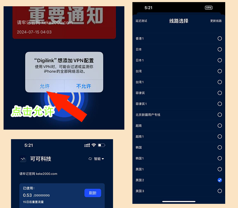 第五步:选择带国家线路链接,需要那个国家的网络就点那个国家开启链接!
